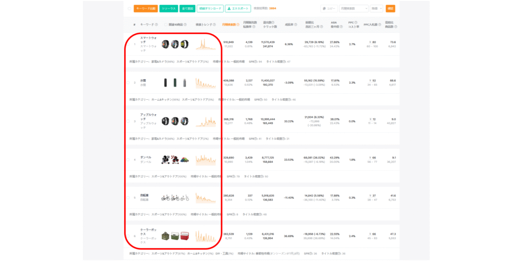 - 検索ボリュームが多いにもかかわらず、競合度が低いキーワードに注目しましょう。これは、まだ多くのセラーが参入していないにもかかわらず、一定の需要がある可能性を示唆しています。