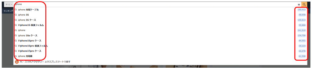 - Amazonの検索窓にキーワードを入力した際に表示されるサジェストキーワードも、重要なヒントになります。これらは実際にユーザーが検索している頻度の高いキーワードであり、SellerSpriteでこれらのキーワードのデータも確認しましょう。