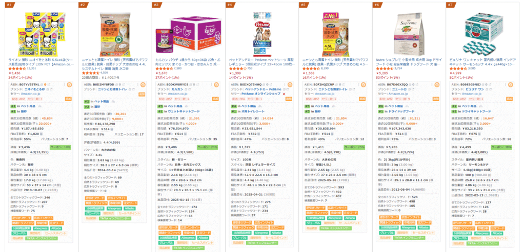 - ペット用品(Pet Supplies):トレンドの変化が早く、感情購買が多い。