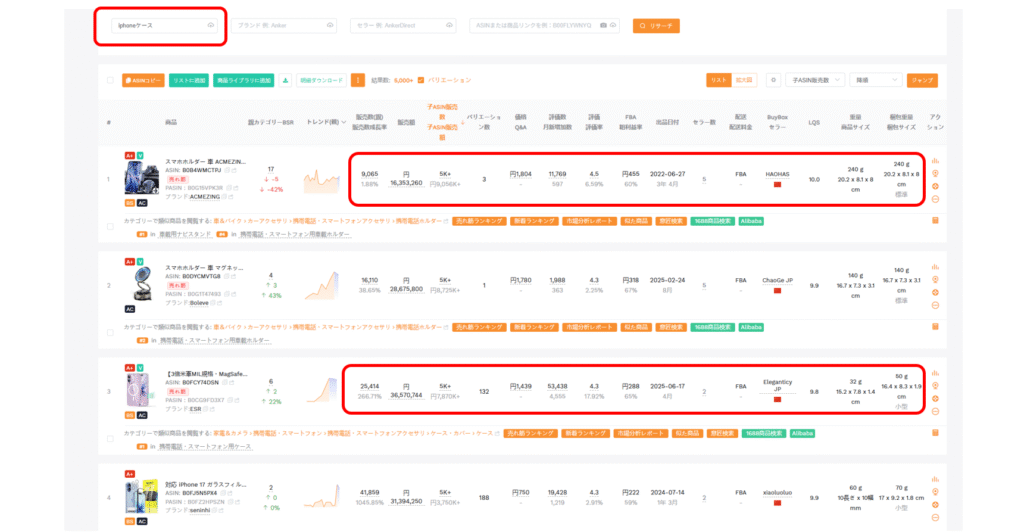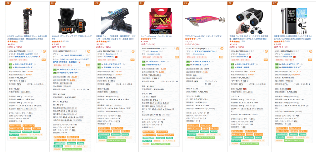 - 「ライバル商品リサーチ」機能で上位10商品の売上・レビュー・価格・出品期間を一覧表示。