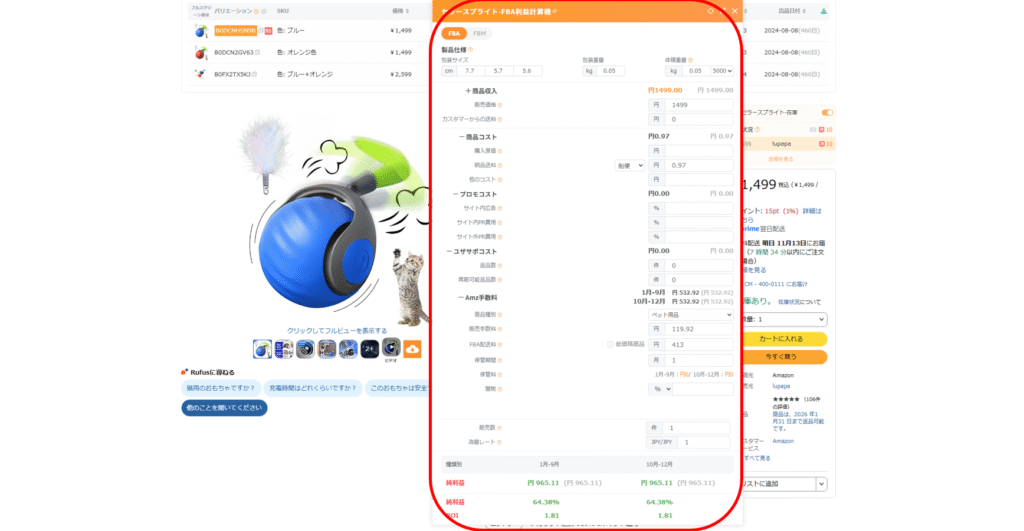 自動的にFBA手数料・推定利益率・純利益額を算出してくれます。